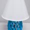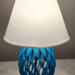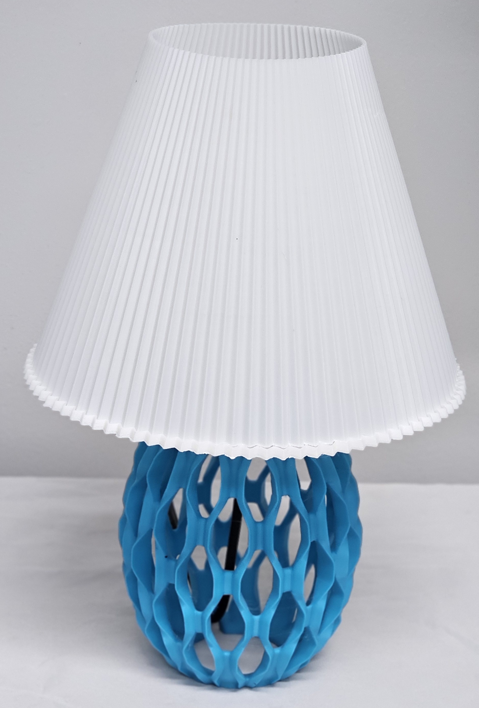 This table lamp is 3D printed and ready for your LED bulb. It is designed by Modern Machine. Lamp stands approximately 14 inches high. The lampshade is approximately 8 inches at its widest point. Lamp base is 3D printed in a bright blue color.