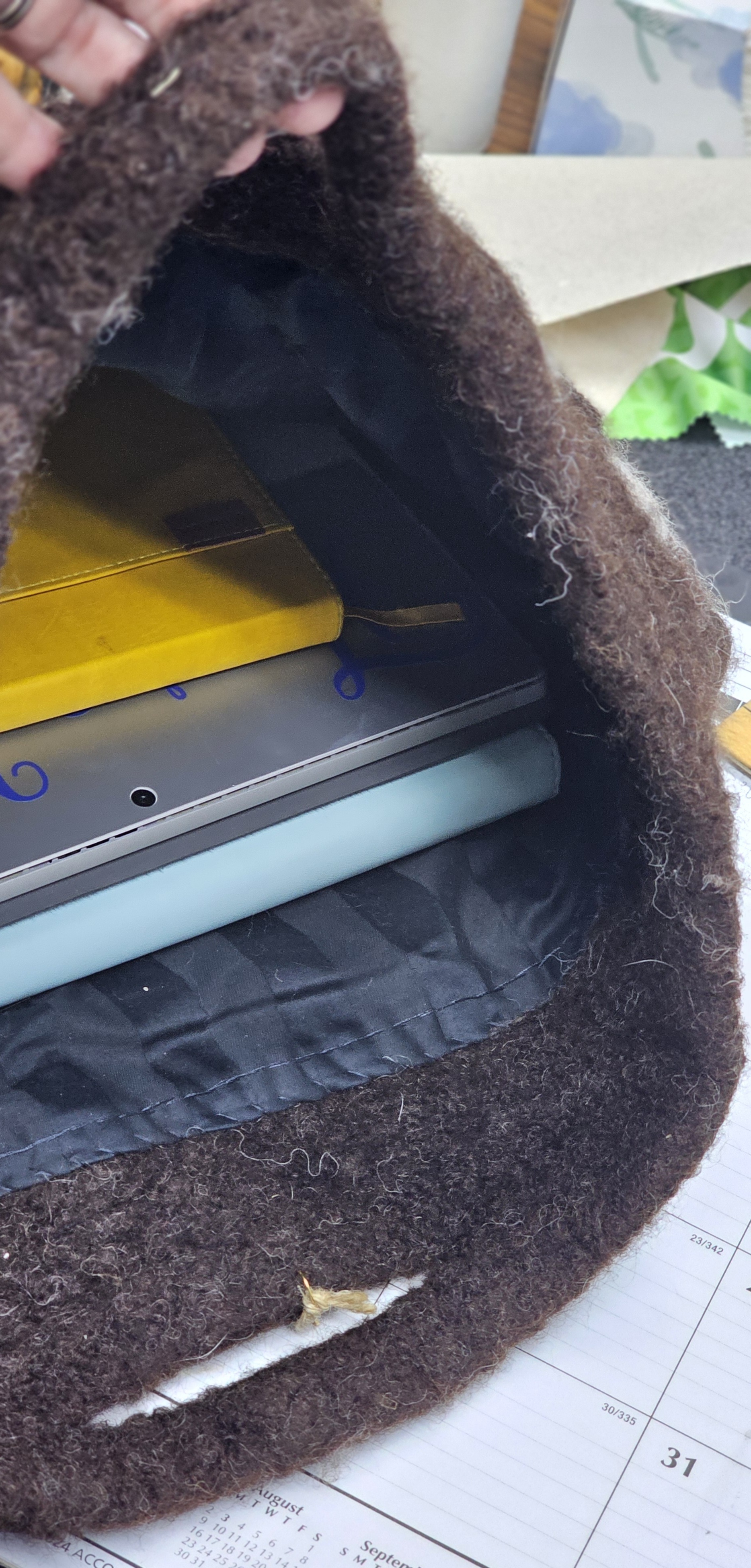 This bag is knitted and felted by hand. The inner lining was sewn on.