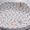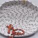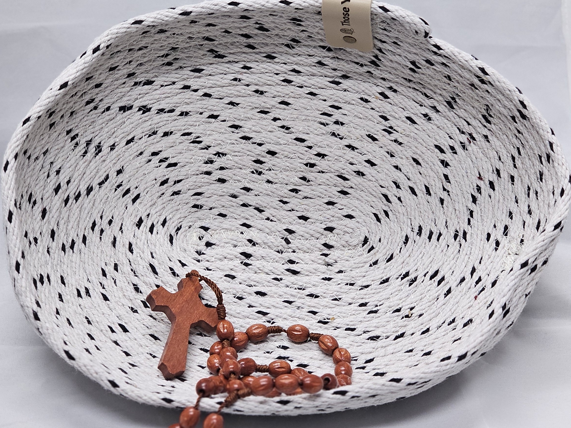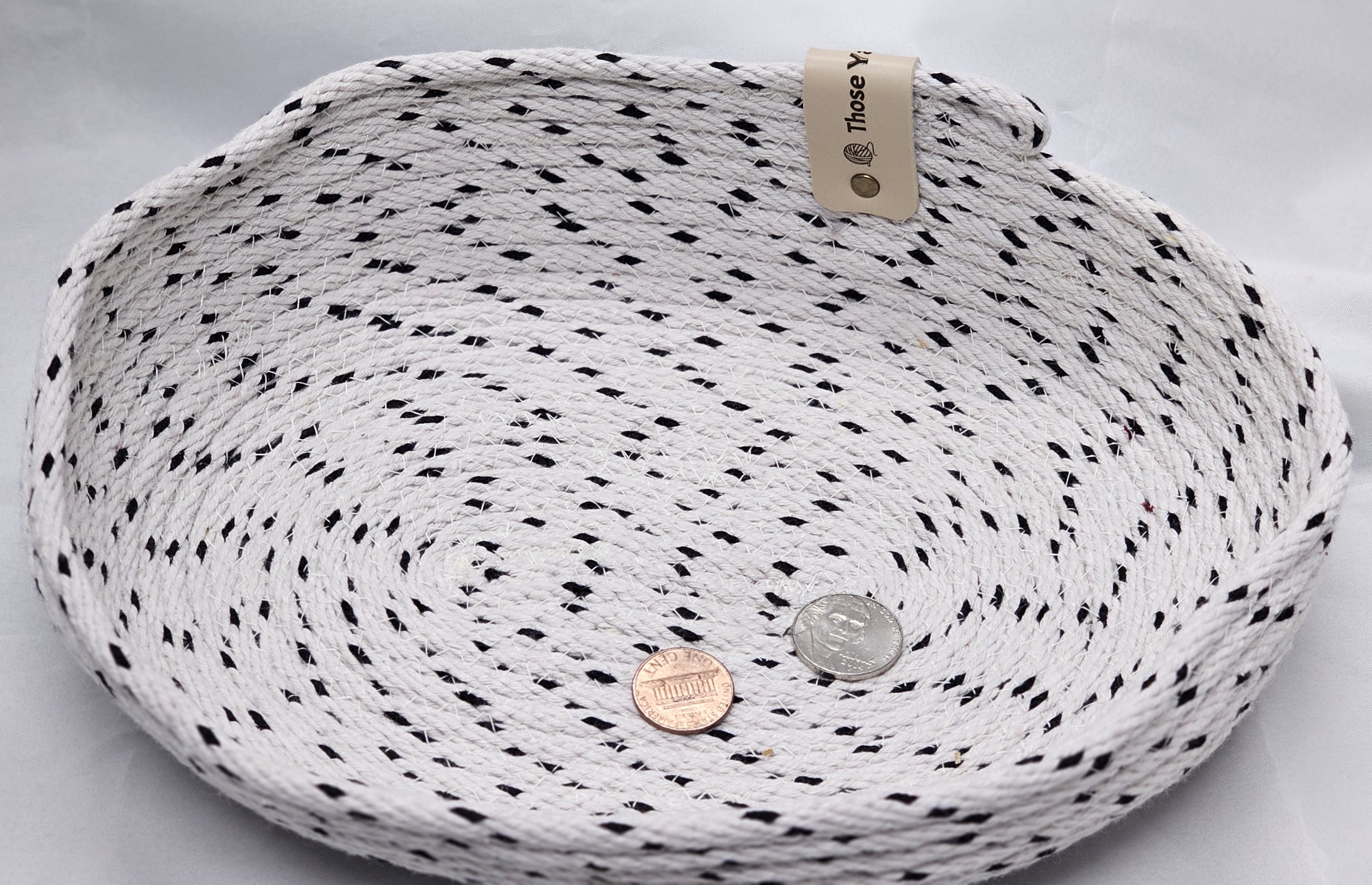 This soft small oval rope bowl is sewn with black and white cotton rope, thread and finished with a leather tag and a rivet.. This will be beautiful for display or to store any number of trinkets or candies. Bowl measures approximately 7 1/2 inches by 2 inches.