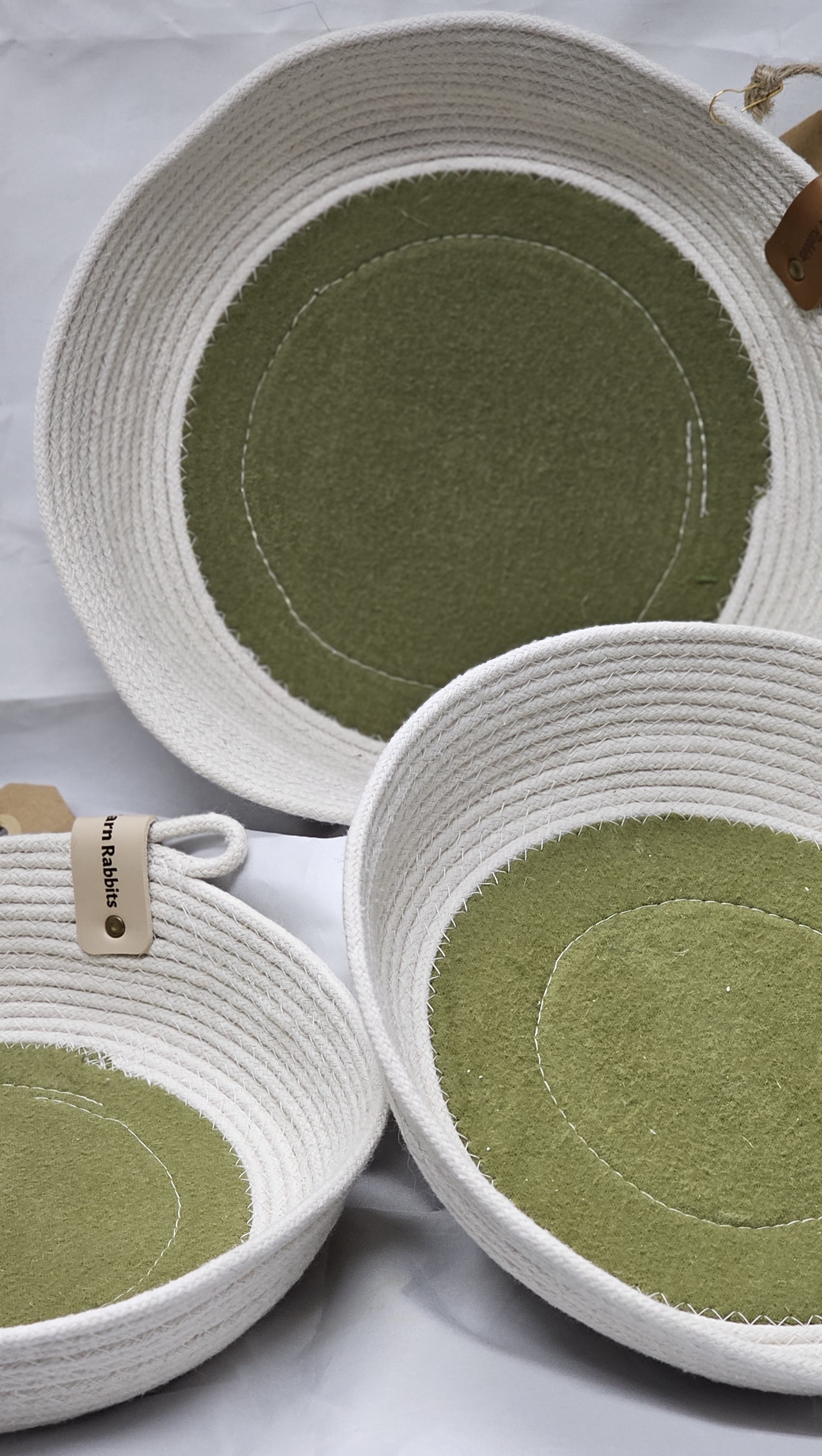 This rope bowl features a forest green bottom for your home decoration and use. The bowl measures approximately 7 inches by 2 inches and is finished with a leather tag and a rivet.