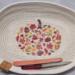 Sewn with cotton rope and thread. Decoupaged with a fall pumpkin made from leaves, berries and pinecones. The bowl is finished with a leather tag and a rivet.