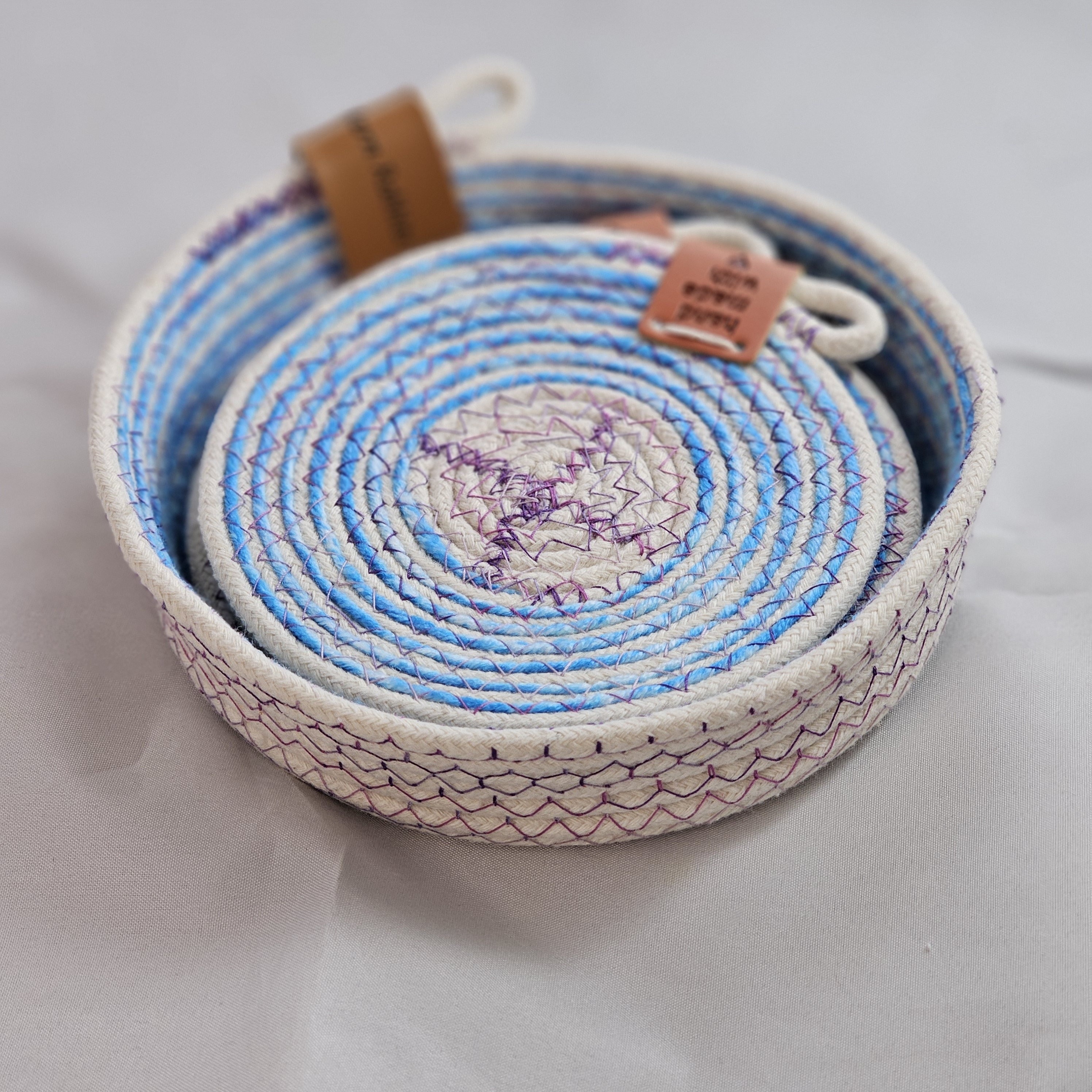 Adorable and functional drink coasters sewn with cotton rope, purple variegated thread, and aqua wool yarn from my Made With Love Series. These are the perfect gift for a new home, apartment or office. This colour theme will go along with a wide variety of settings. This set is stiffer than other sets we offer.