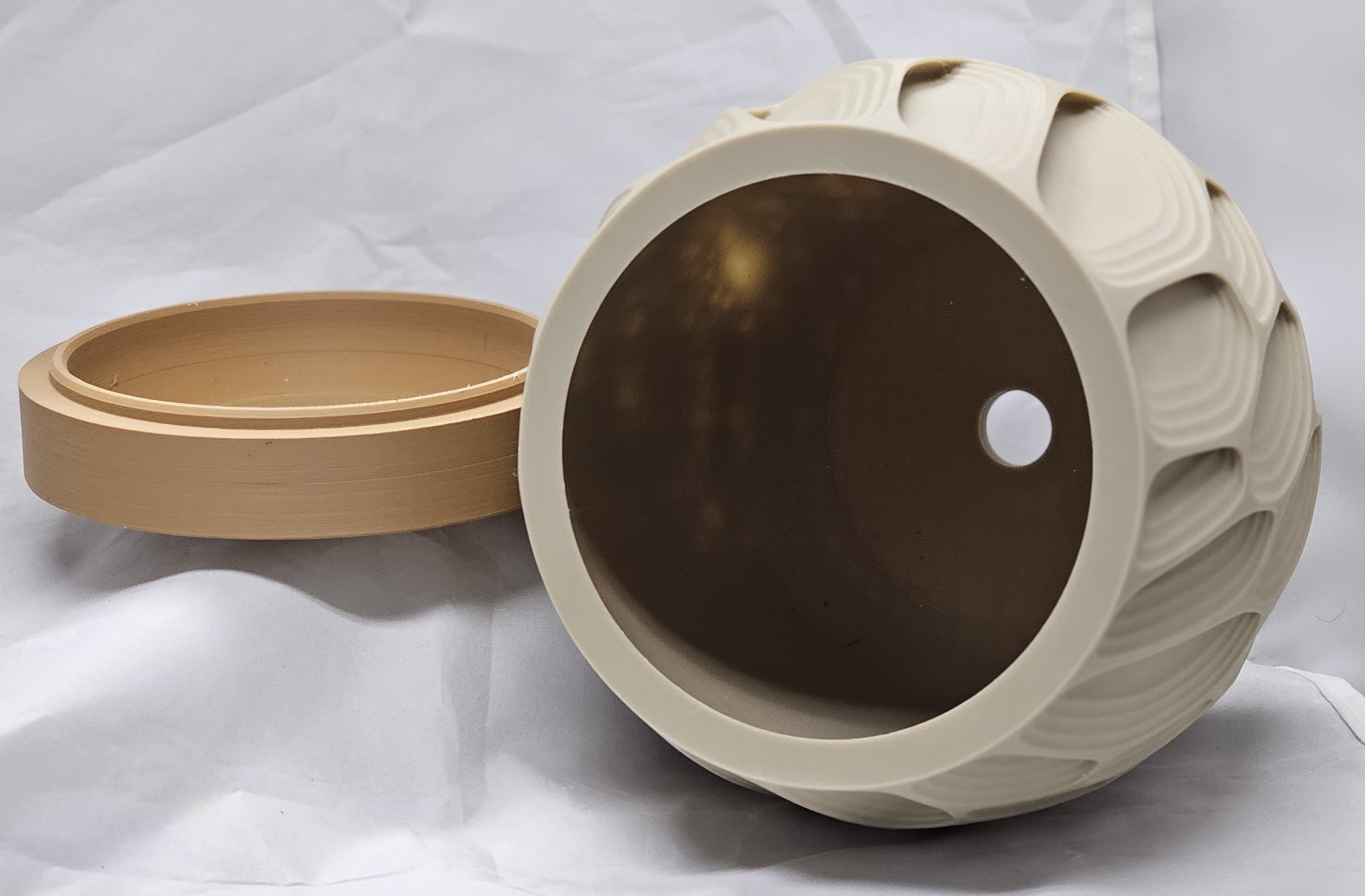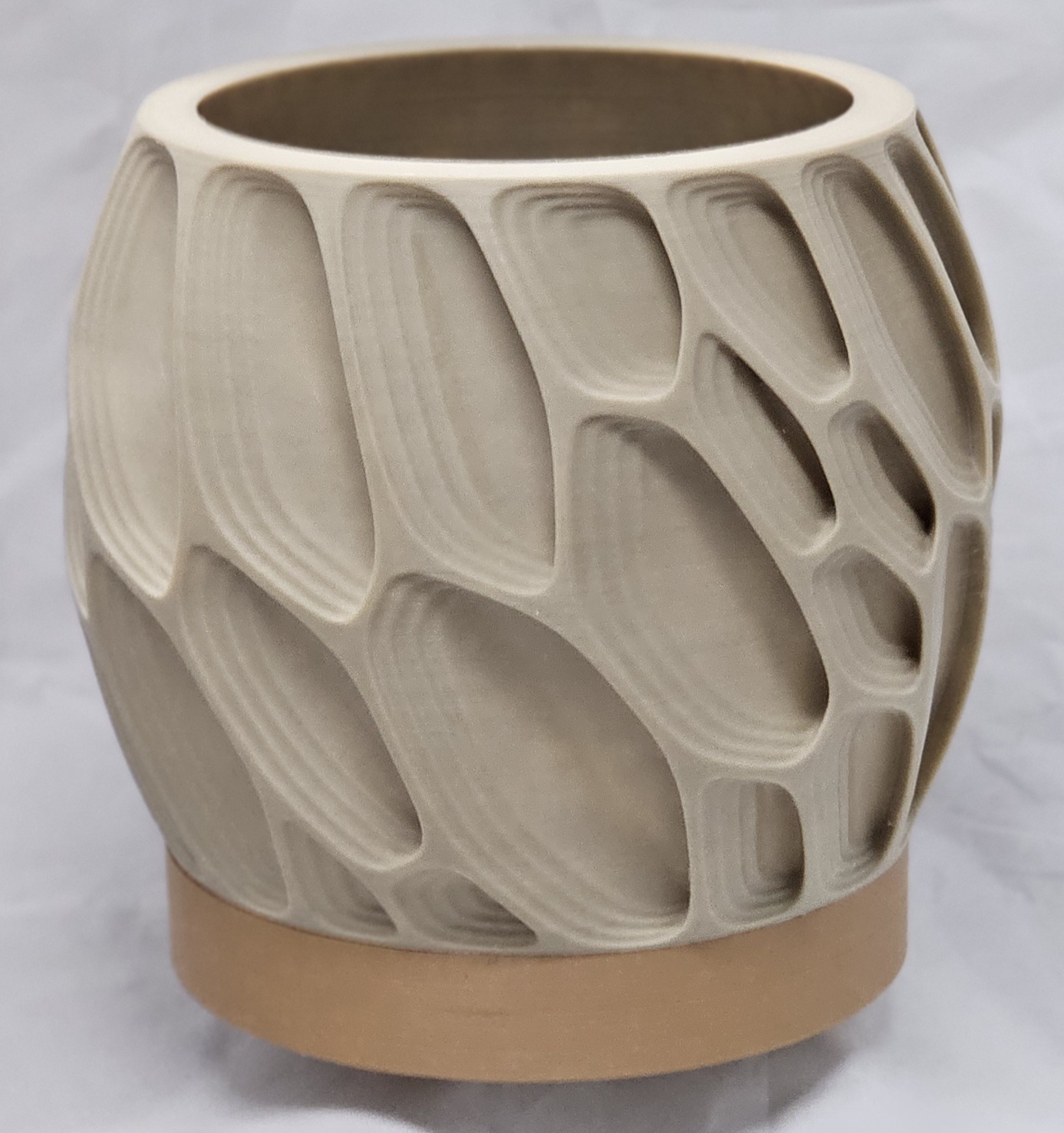 This 3D printed plant pot and water tray is designed by Modern Machine and printed in two tones of tan color. It makes a beautiful and modern look for your indoor plants. Pot and tray measures 6inches high, 5 inch base and 4.25 inch opening. The pot is around 6 inches at its widest point.