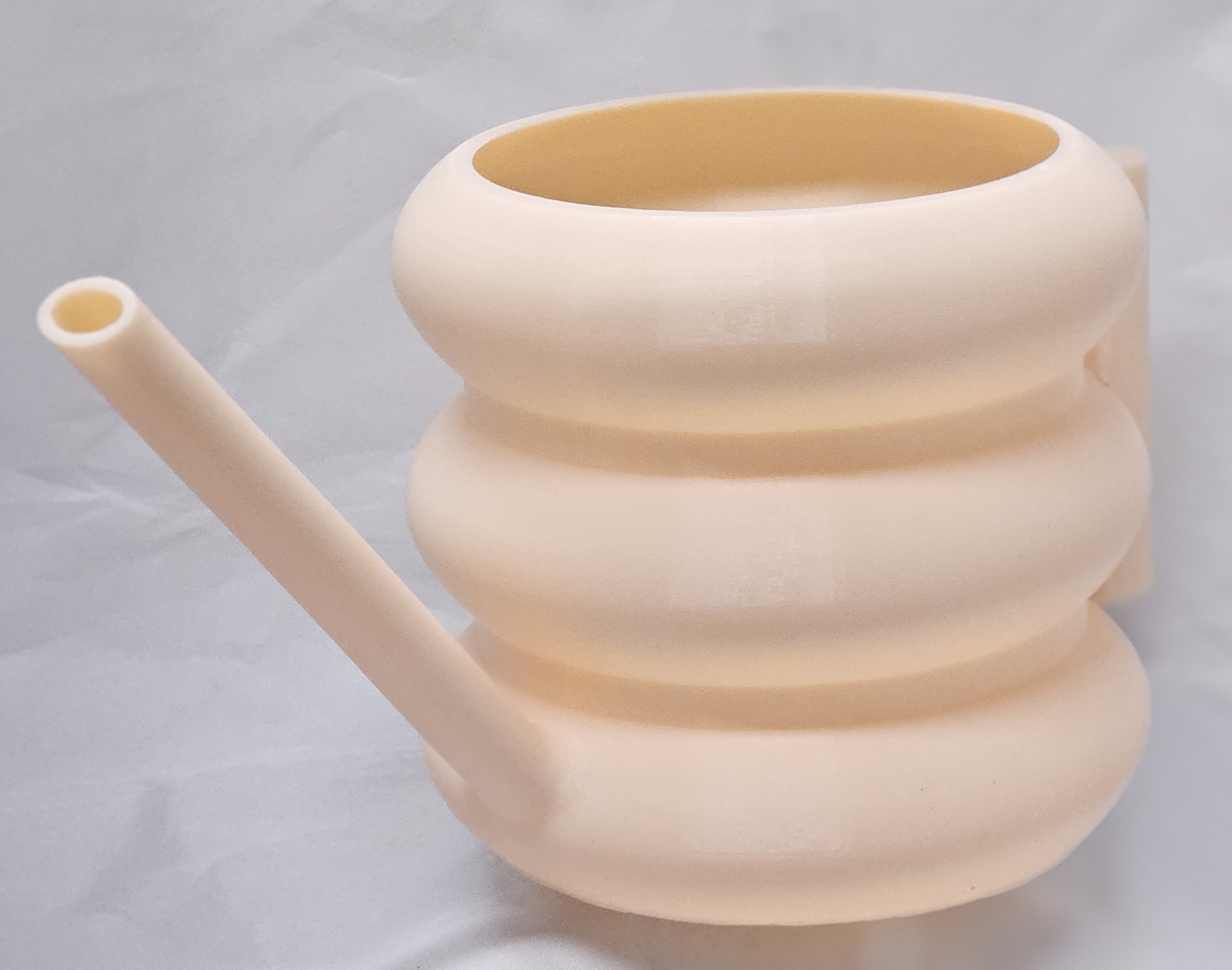 These 3D printed watering can is designed by Modern Machine. The light peach color is modern and useful for home or garden plant needs. It has been tested and does hold water to allow plant watering.
